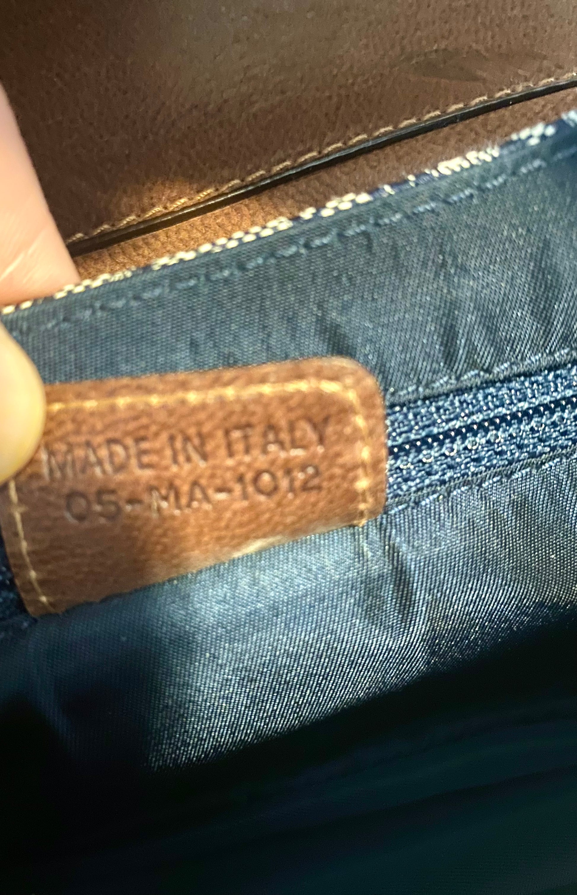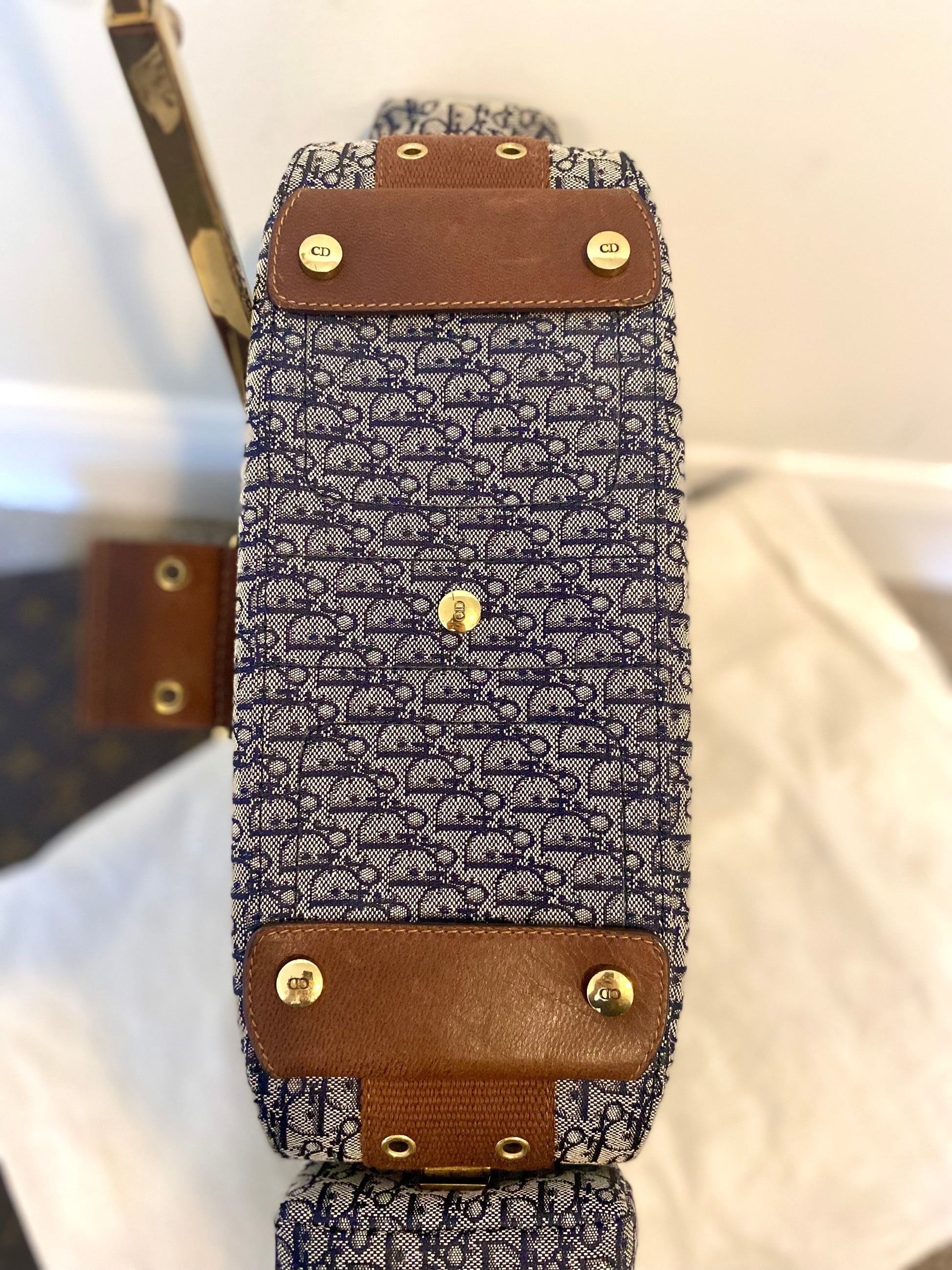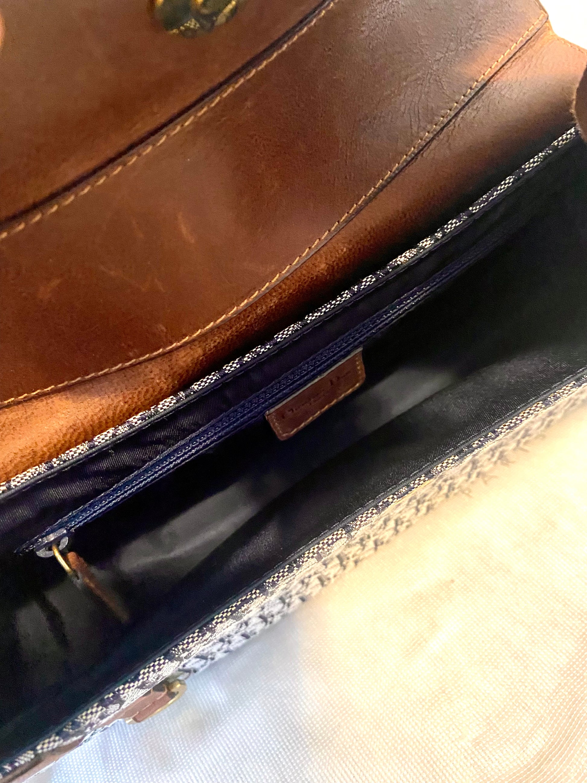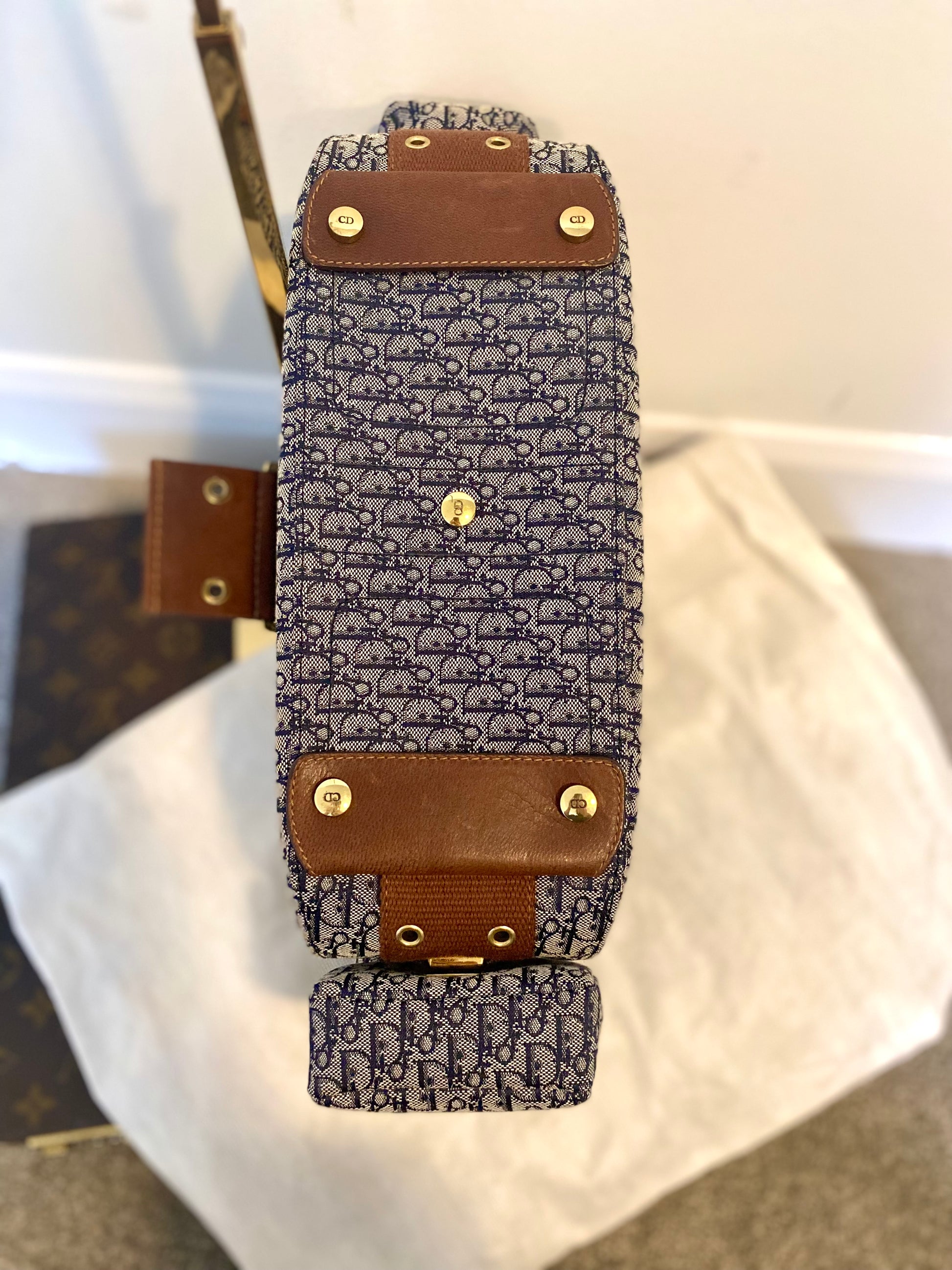 - Blue monogram canvas body with brown leather details.